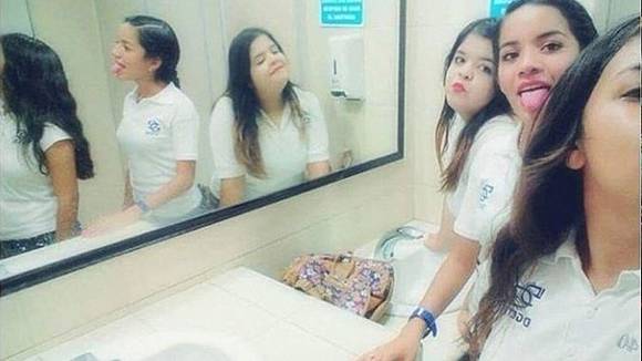 Gadis-gadis ini mengambil foto di toilet sekolah mereka.