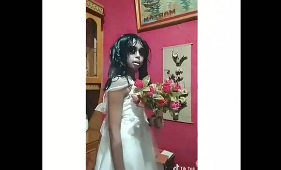 Tak hanya itu, bocah perempuan itu pun mengenakan gaun berwarna putih. Percis sekali dengan gaun hantu suzana yang biasanya mengenakan kain putih. Dengan bucket bunga di tangan, dia berakting seperti seorang pengantin perempuan yang mati mengenaskan.